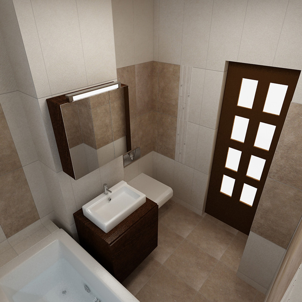 Ein dreidimensionales visualisiertes Interieur. Hierbei handelt es sich um ein Badezimmer in Brauntönen, welches von oben gezeigt wird. Bei der Einrichtung der Wohnung wurde großer Wert auf zeitgenössische Einrichtung, jedoch auch auf Naturmaterialien gelegt. Der Badezimmerschrank und der Waschbeckenschrank sind aus dem gleichen rustikalen Holzelement. Sowohl der Raum selbst, als auch die Einrichtung und Ausstattung sind komplett am PC entstanden. Hierbei wurde auf eine möglichst realistische Visualisierung geachtet.
