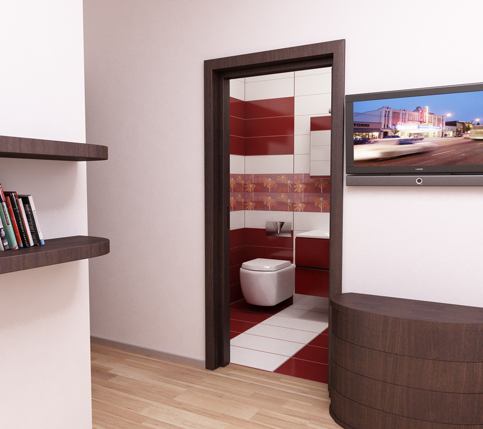 Ein dreidimensionales visualisiertes Interieur. Hierbei handelt es sich um den Eindruck des Badezimmers bei offener Tür. Bei der Einrichtung der Wohnung wurde großen Wert auf zeitgenössische Einrichtung, jedoch auch auf Naturmaterialien geachtet. Sowohl der Raum selbst, als auch die Einrichtung und Ausstattung sind komplett am PC entstanden. Hierbei wurde auf eine möglichst realistische Visualisierung geachtet.