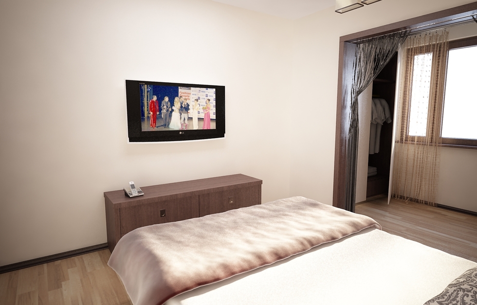 Ein dreidimensionales visualisiertes Interieur. Hierbei handelt es sich um ein schlichtes Schlafzimmer. Bei der Einrichtung der Wohnung wurde großer Wert auf zeitgenössische Einrichtung gelegt, jedoch auch auf Naturmaterialien geachtet. Im Zimmer findet ein niedriges Sideboard aus Holz platz ohne unnötige Verzierung. Auf der Seite hat man einen kleinen Eindruck vom räumlich abgetrennten Kleiderschrank. Sowohl der Raum selbst, als auch die Einrichtung und Ausstattung sind komplett am PC entstanden. Hierbei wurde auf eine möglichst realistische Visualisierung geachtet.