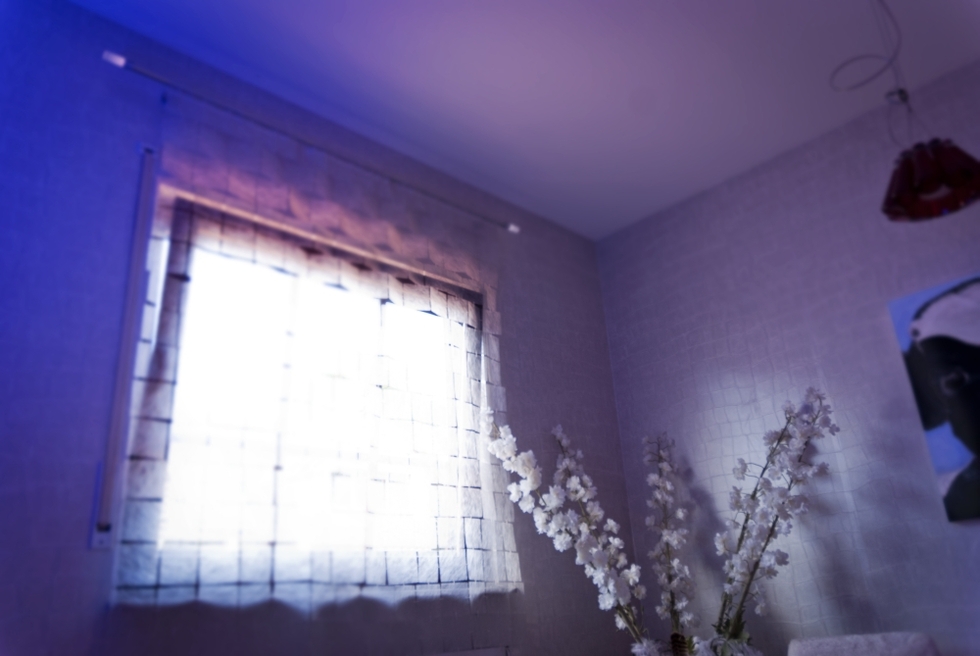 Die Gardine greift dezent eine Variation des Kachelmusters an der Wand auf