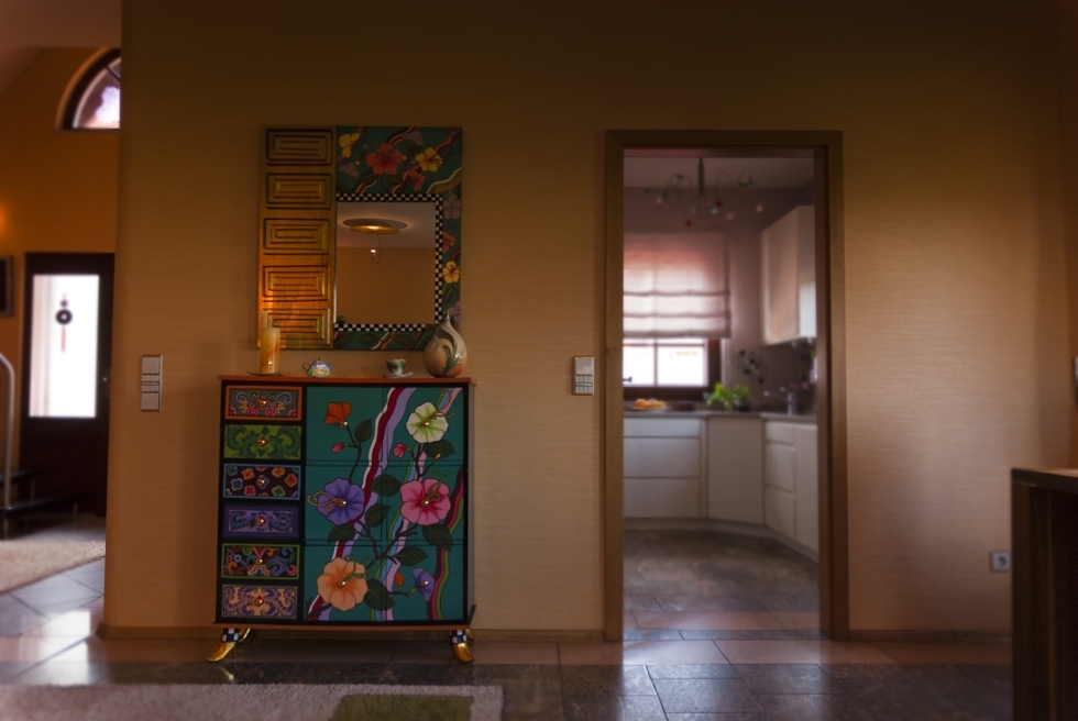 Bevor man in die Küche kommt, wird ncohmals der Stil der Wohnzimmers aufgegriffen indem an die Wand eine bunte Kommode gestellt wurde.